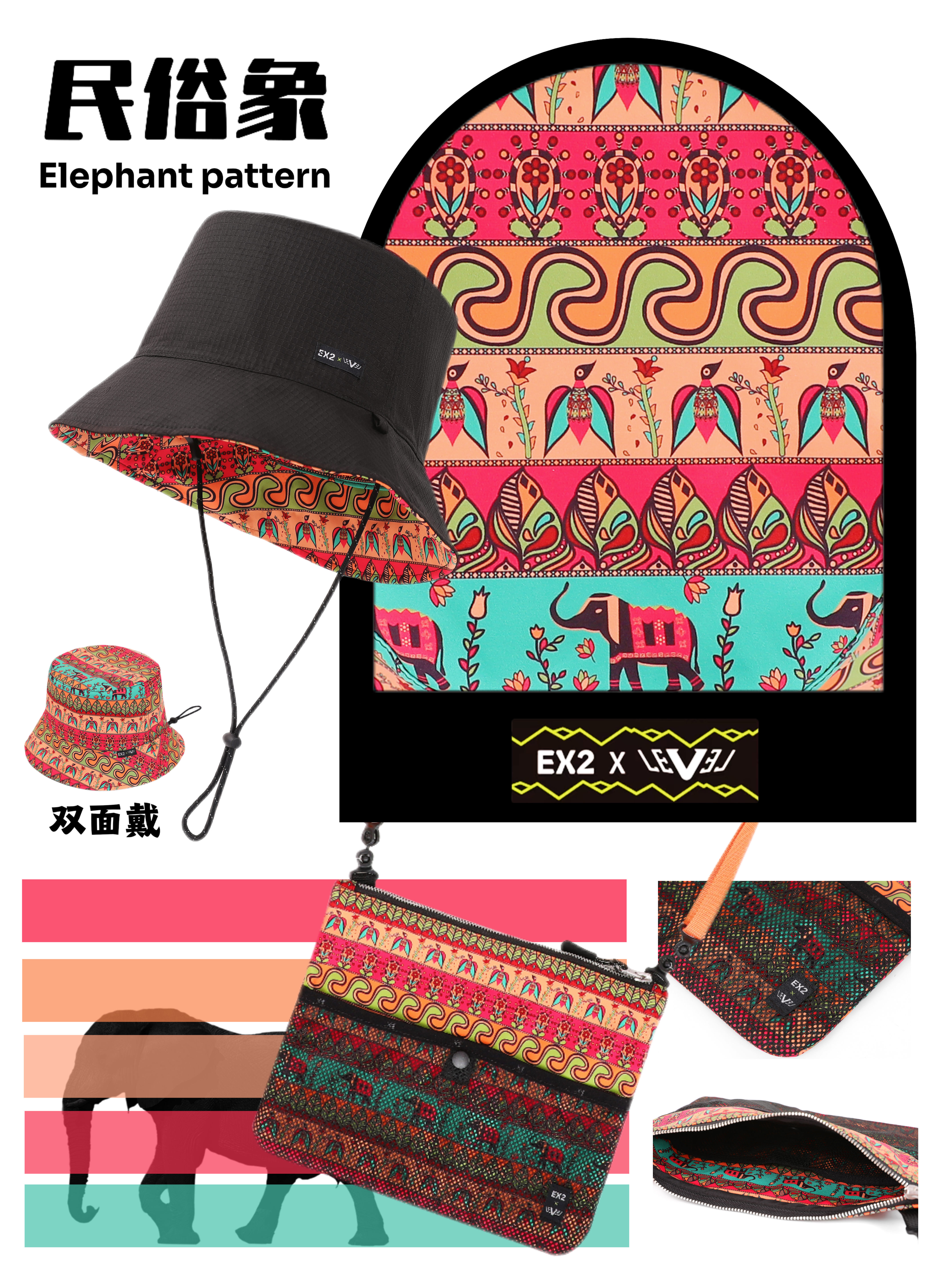 EX2 x LEVEL联名IP款渔夫帽和斜挎包 以古老的东方纹理「象纹」为灵感