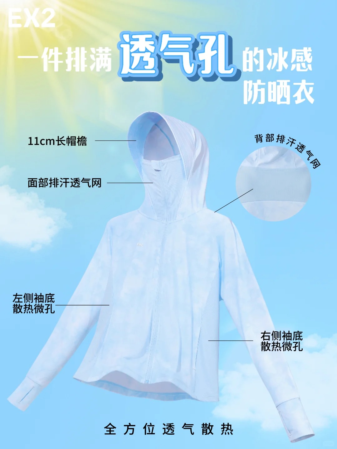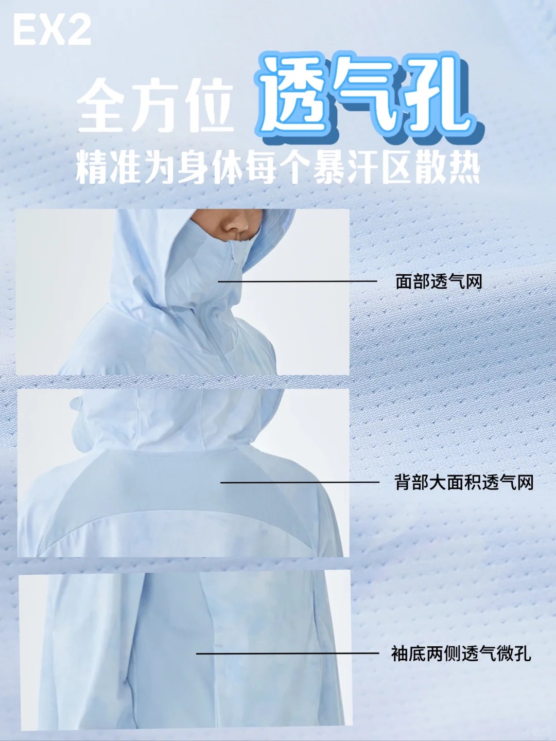 UPF高于国标50+是基本操作 拼接式排汗透气网遍布暴汗位置是惊喜设计 夏日高温穿上它不仅持久防晒还不闷热 触肤凉感冰丝面料舒服得不想脱掉